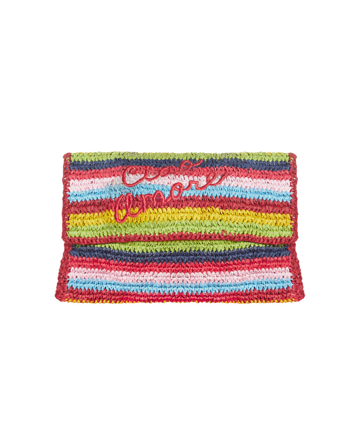 "Hello Love" multicolor stripes mini clutch in raffia with embroidered logo